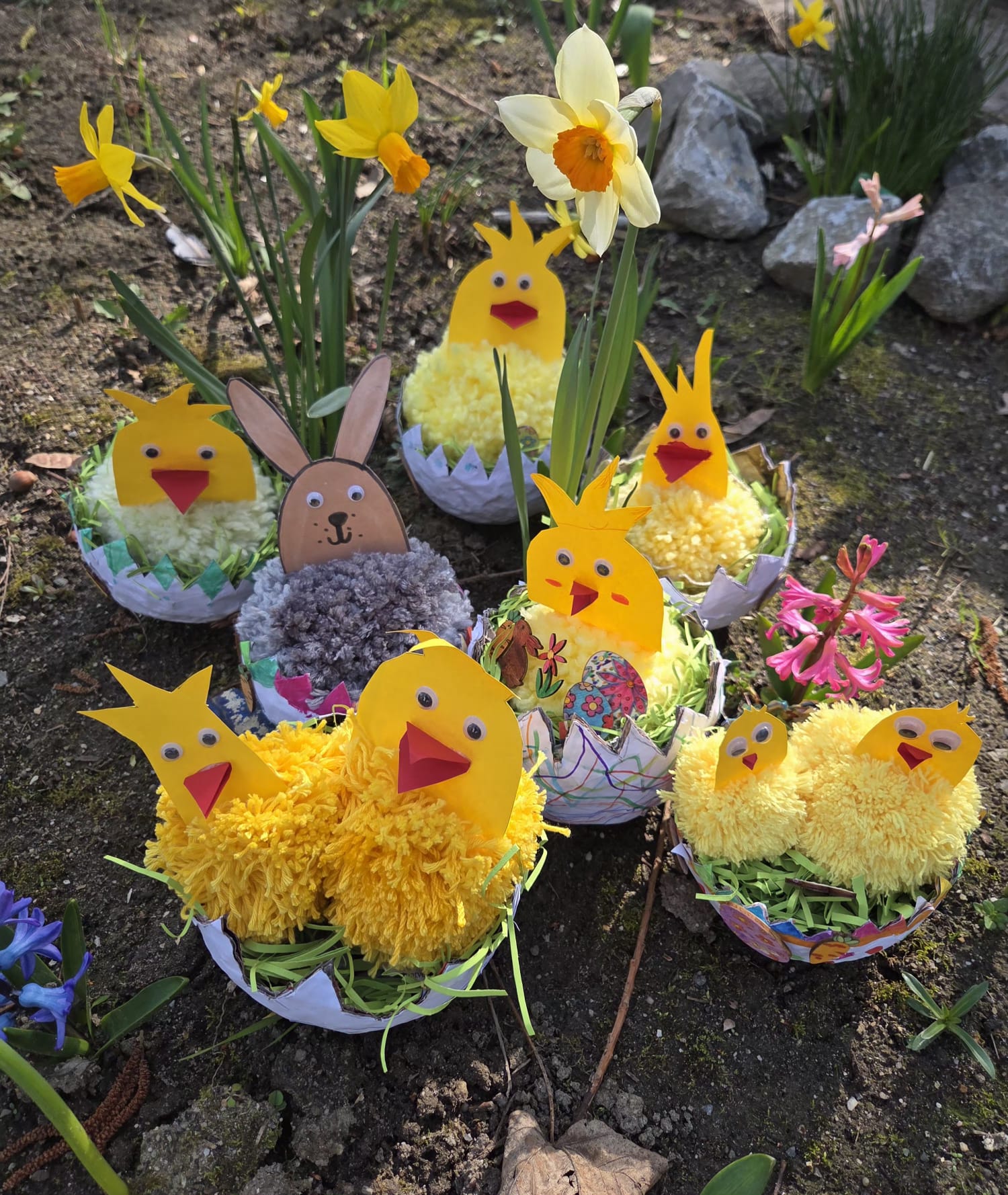 Rechtzeitig zu Ostern wurde die Deko des 5er Kreativkurses unter der Leitung von Frau Schenk fertig. Anschließend probierten die Schülerinnen und Schüler aus, wie man die kleinen Kunstwerke am besten präsentieren kann. Der Schulgarten mit den farbenfrohen Blumen war hierfür der perfekte Ort!