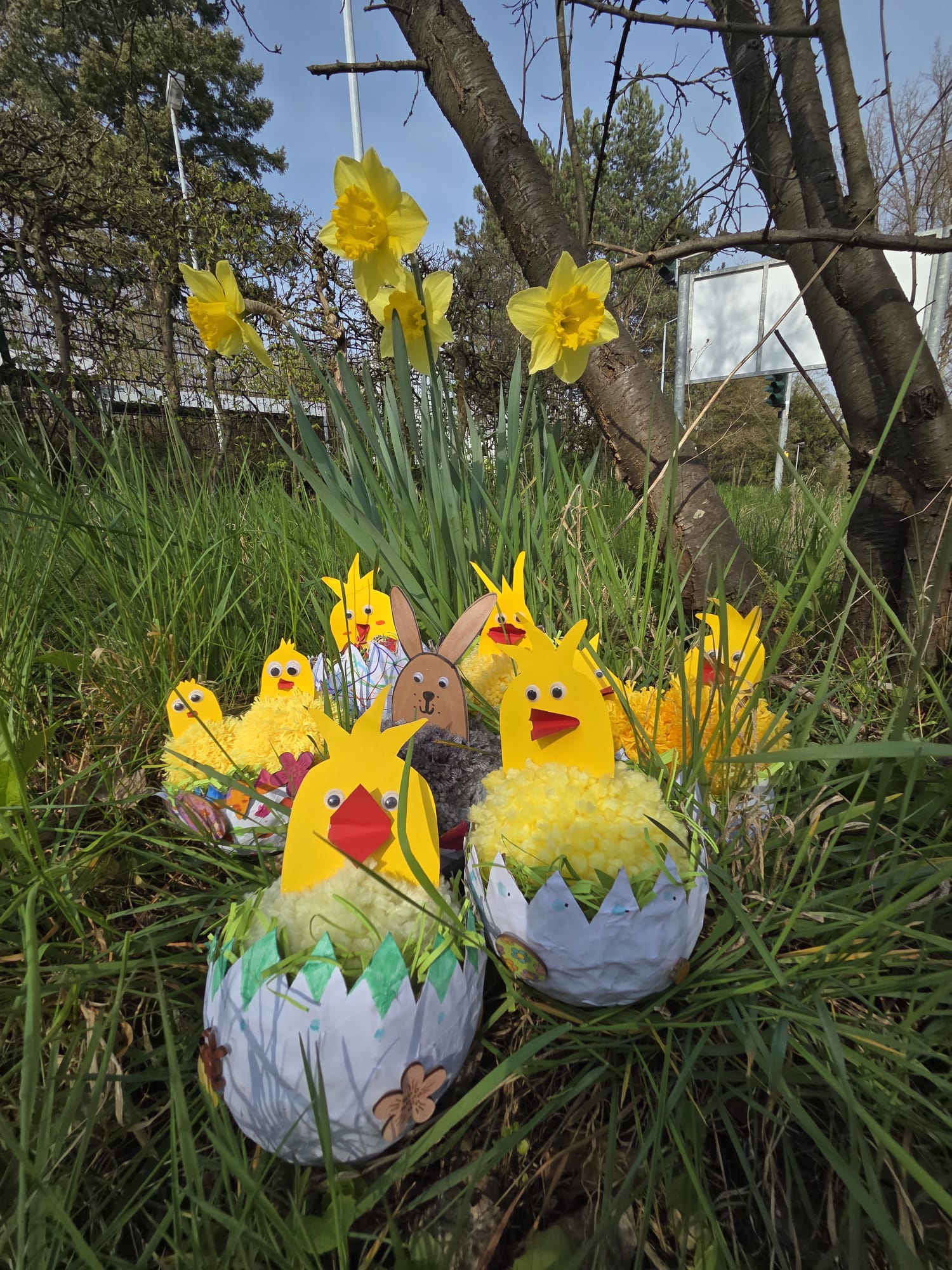Rechtzeitig zu Ostern wurde die Deko des 5er Kreativkurses unter der Leitung von Frau Schenk fertig. Anschließend probierten die Schülerinnen und Schüler aus, wie man die kleinen Kunstwerke am besten präsentieren kann. Der Schulgarten mit den farbenfrohen Blumen war hierfür der perfekte Ort!